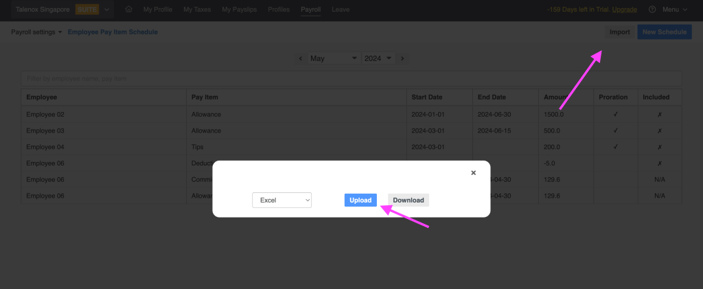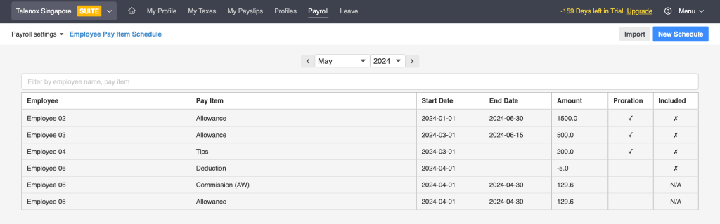- Unique Pairings: Each employee-pay item combo must be unique. If “Employee 02” and “Allowance” pair exist, you cannot create another same pairing. Importing the same combo will overwrite the current one. If you use manual New Schedule, you won’t be able to save it and will see an error warning message.
