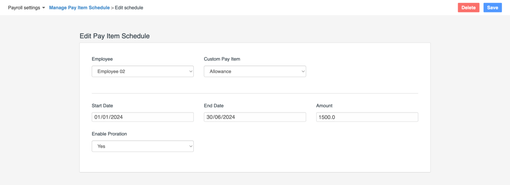 - Prorated Pay Items: Automatically adjust payments based on when an employee joins or leaves during a pay period.