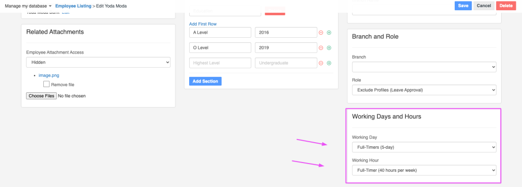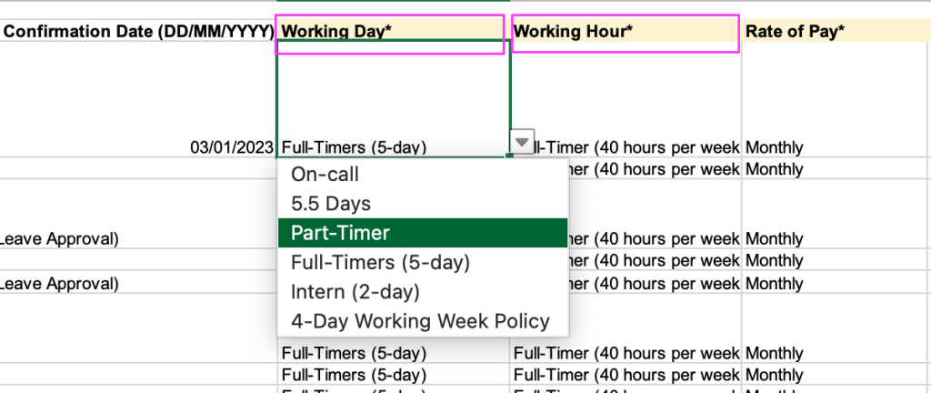 NOTE: The drop-down list in the employee data importing sheet will only show the options you’ve created in the “Working Hours Setting” and “Working Days Setting” in the Company Details page (found under Profiles > Company Details). So make sure to populate these fields first.
