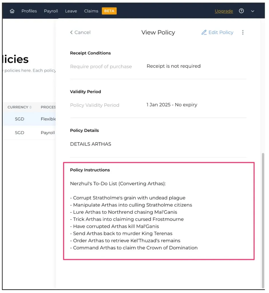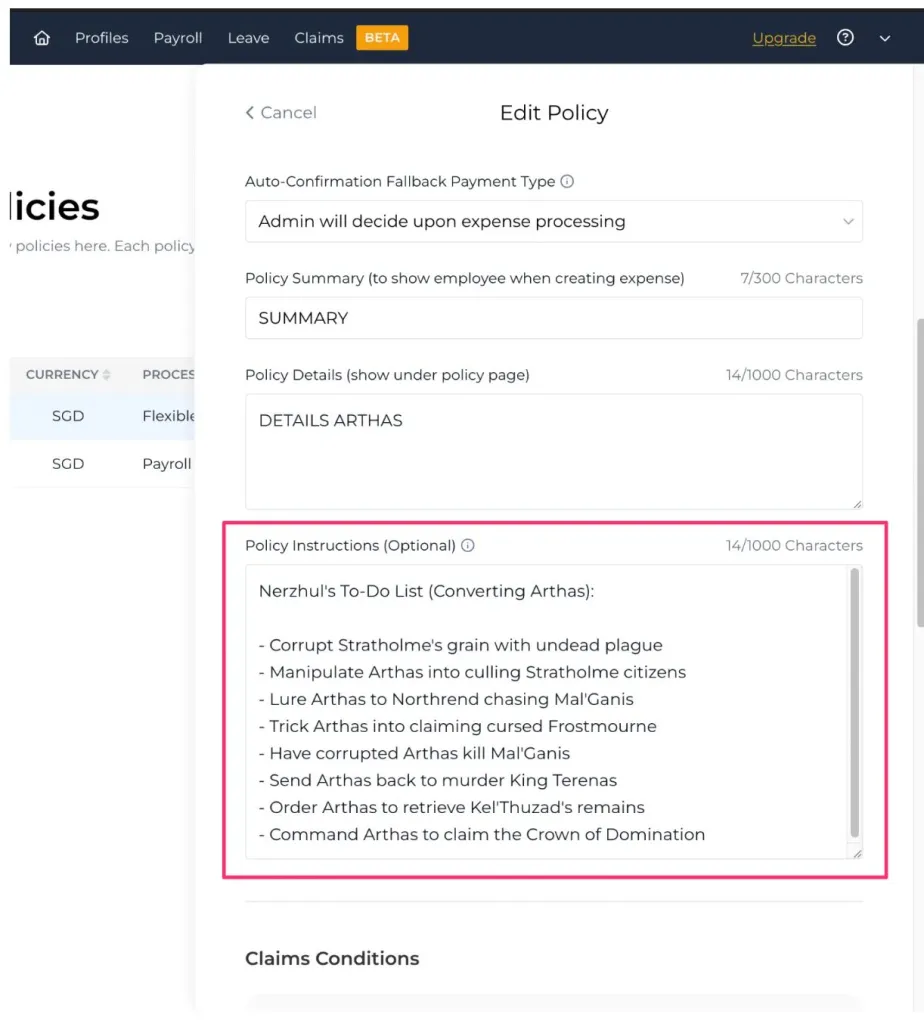 Admins can now add clear instructions directly inside each claims policy. This helps employees know exactly how that policy should be used before they submit anything.