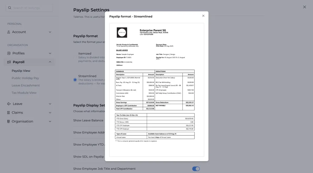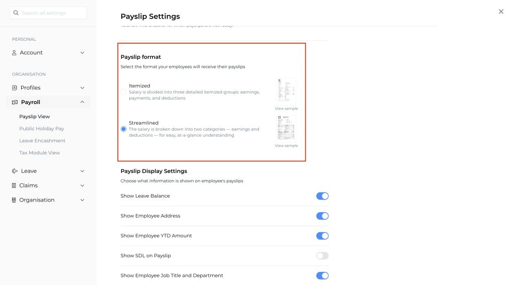 You now have more control over how payslips look and what they show. These new settings live under Accounts & Preferences > Payslip.