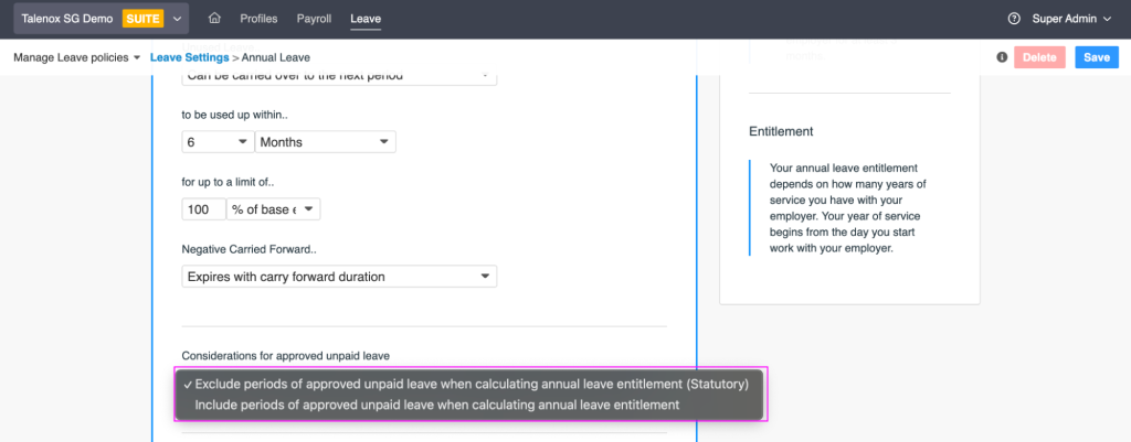 Previously, the system lacked the flexibility to exclude periods of approved unpaid leave when calculating annual leave entitlement. With our latest update, you now have two options to align with MOM guidelines: