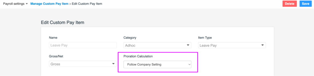 For users with varying calculations for ‘Attendance’ pay items, customisation is now possible. Within the “Hourly/Daily Attendance” tab, users can head to the Custom Pay Items settings page to select their preferred proration settings for individual pay items.